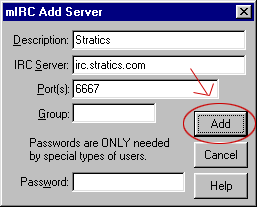 For the description of the server, you can have it be whatever you want. The port used for Stratics is 6667 and leave the group and password fields blank. Click ok and you can now connect to the Stratics IRC Servers.