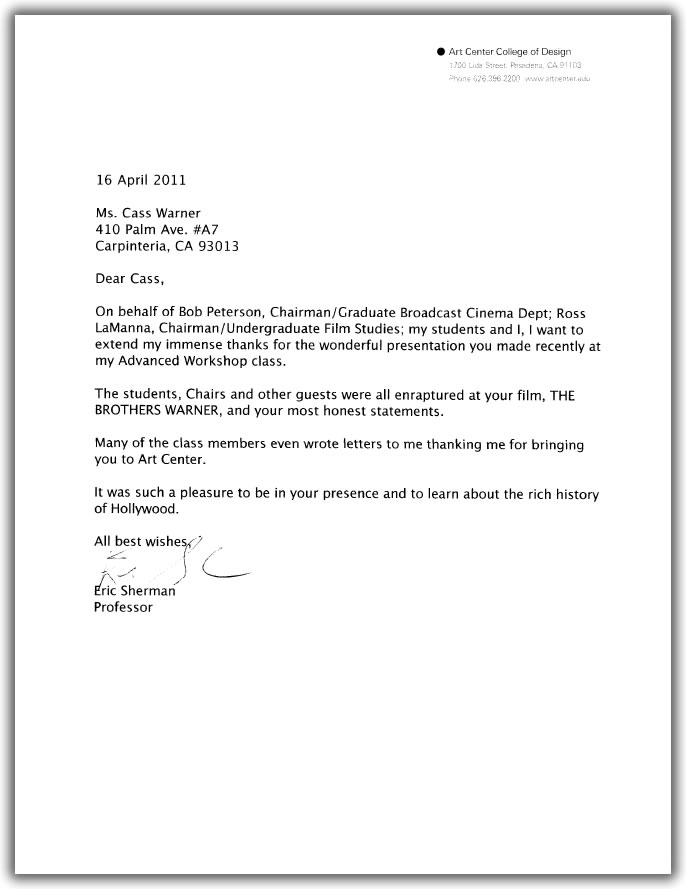 "I found, out of all the guest speakers that came to class this term, Cass Warner the most interesting. Before I even saw her film, it was her entire personality that struck me. She was humble and inspiring…”